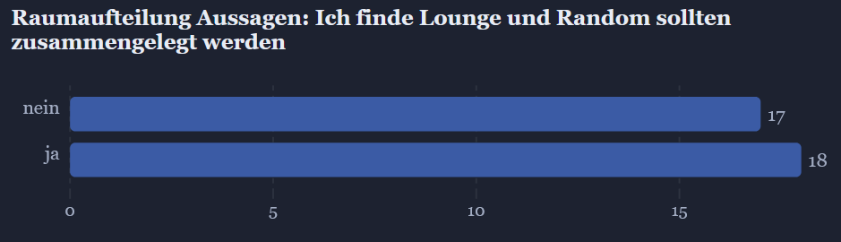 Einige Wochen vor Erstellen der Umfrage gab es im Chat eine Diskussion zur bestehenden Raumaufteilung in Lounge, Sexualität&BDSM und Random. Eine überwiegende Mehrheit findet die bestehende Aufteilung gut, wobei in der Folgefrage exakt Hälftig für und gegen eine Zusammenlegung von Lounge und Random votiert wurde. Einige Wünschen sich mehr Räume. Daraus ergibt sich, dass die meisten in Summe dieselbe Anzahl an Räumen wünschen, dabei aber viele sich einer zusammengefassten Lounge/Random, einen BDSM Raum und einen Anfängerraum besser vorstellen können. Zusätzlich wurde sich ein BDSM-Random gewünscht. Darüber werden wir nachdenken.