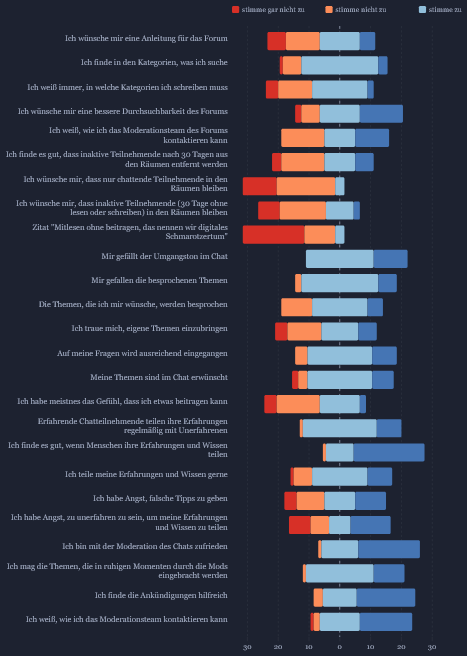 Auf Fragen wird überwiegend eingegangen und ein großer Teil hat das Gefühl, die eigenen Fragen und Themen seien erwünscht. Denjenigen, die dieses Gefühl nicht haben möchten wir klar sagen: Traut euch, die Themen einzubringen. Wenn ihr unsicher seid, ob ein Thema gar nicht passt schreibt dem Mod Team. Und falls ein Thema mal wirklich nicht angenommen wird, weil die passenden Personen gerade nicht online sind, nehmt die Frage oder Diskussion mit ins Forum - dort können sie länger gelesen werden und dadurch auch zeitversetzt noch beantwortet werden.