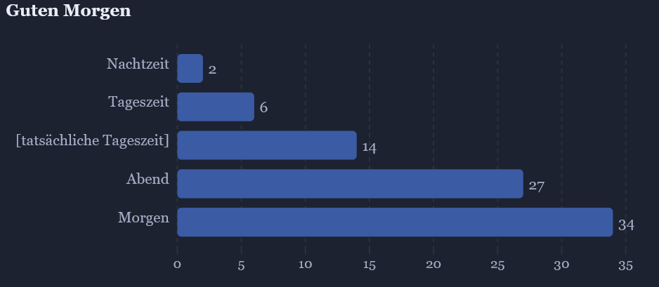 Guten Morgen wurde mit 34 stimmen am häufigsten gewählt, dicht gefolgt von Guten Abend mit 27 Stimmen. Katzenbaby fühlt sich hiermit endgültig bestätigt.
